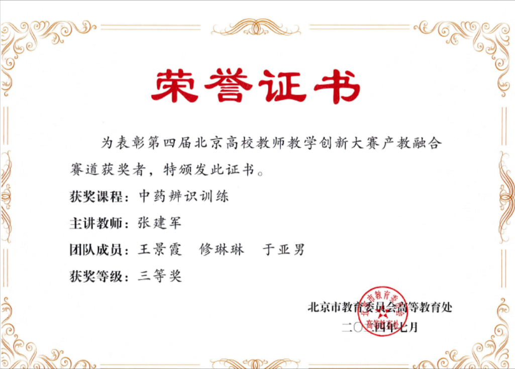 课程组荣获第四届北京高校教师教学创新大赛产教融合赛道三等奖,参与的中医基本技能训练Ⅰ入选北京市思政课程示范课程、授课教师入选课程思政教学团队。课程组参与的中医基本技能训练Ⅰ、Ⅱ(线下线上混合式一流课程)荣获yl9193永利集团一流课程建设点项目、参与的中医基本技能训练教学团队荣获yl9193永利集团优秀本科育人团队。团队教师修琳琳获第十二届北京市青教赛医科类一等奖,课程负责人张建军教授获得优秀指导教师奖。张建军教授、王淳教授、王景霞教授荣获yl9193永利集团教学成果二等奖。张建军教授入选yl9193永利集团“岐黄英才·教学名师培育计划”。(图4)