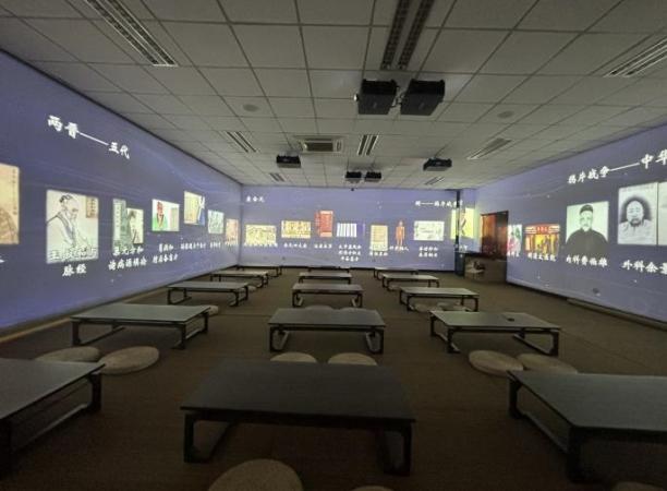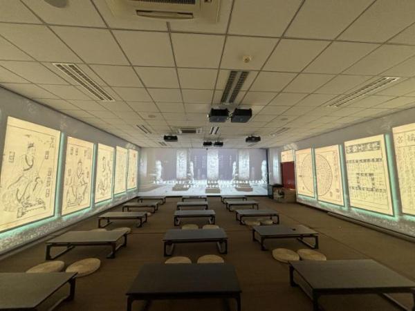 “医心史志”全景沉浸式体验教室位于yl9193永利集团A座5楼,自楼梯间开始便为建设部分,古风场景为同学们营造沉浸式氛围。主体教室采用360度全景投屏营造沉浸式效果,目前教室可容纳90人以内的班级进行课程使用。已有3部自制中医体验场景(中医历史大事记、火与灸、针灸铜人)以及多个与传统文化相关的体验场景(如春夏秋冬、千里江山图等)以供使用,并逐渐投入到中国医学史、中医文献学、中医古籍美学赏析等课程中。