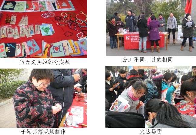 五元钱的贺卡,十元钱的手机链,价钱虽然不多,但都是残疾人亲手制作的,蕴含着一种用劳动创造财富的意义在其中,要知道,要做出这样的工艺品,他们要比正常人多付出多少努力!特别值得一提的是,有一位研究生师姐,留下了一百元钱,要走了慧灵的联系方式,并且承诺有时间回去参加志愿活动,却没有带走任何的卖品,也没有留下自己的姓名,这给当天所有参加活动的人都留下了一份感动。