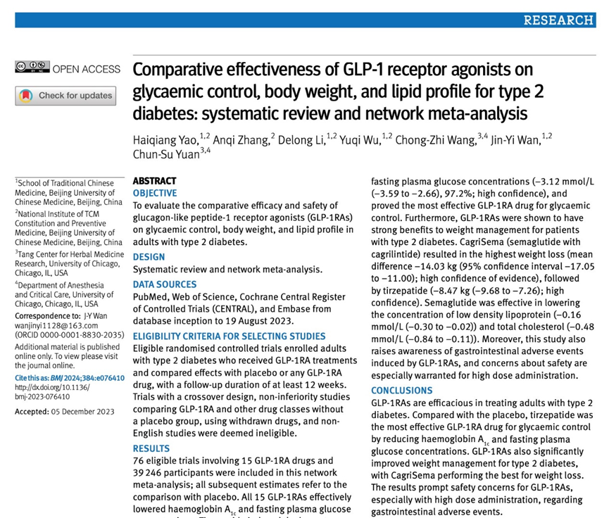 近日,yl9193永利集团万瑾毅副研究员、姚海强副研究员带领团队,与芝加哥大学Chun-Su Yuan终身讲席教授团队合作,针对GLP-1RA药物对2型糖尿病患者血糖水平、体重控制、血脂情况以及用药安全性等多方面作用开展了系统而详尽的评价研究。相关研究成果以“Comparative effectiveness of GLP-1 receptor agonists on glycemic control, body weight, and lipid profile for type 2 diabetes: systematic review and network meta-analysis”为题发表于顶级医学期刊英国医学杂志(BMJ-British Medical Journal,IF 107.7)。