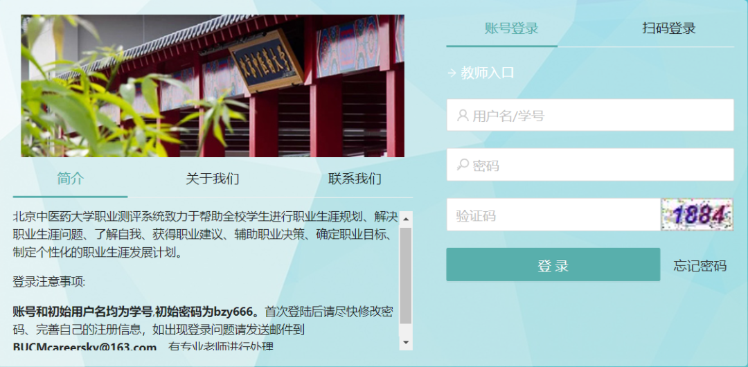 进入职业测评页面后输入用户名和密码:初始用户名为学号,初始密码为bzy666。