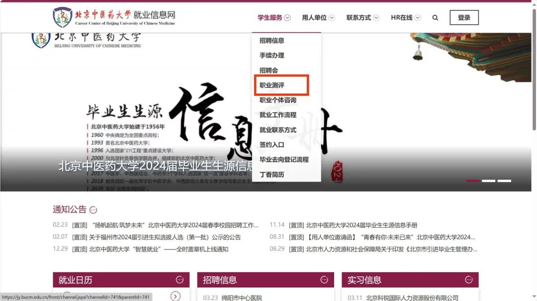 1) 若使用电脑端登录,可打开公司就业信息网网址:https://jy.bucm.edu.cn/,打开页面后,点击上方“员工服务”一栏,选择“职业测评”。