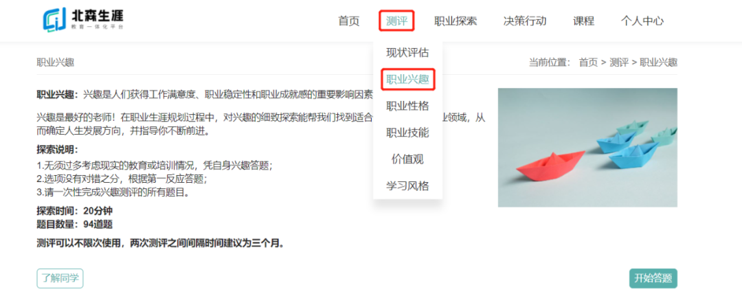 测评主要包括“现状评估”,“职业兴趣”,“职业性格”,“职业技能”,“价值观”,“学习风格”六个方面。