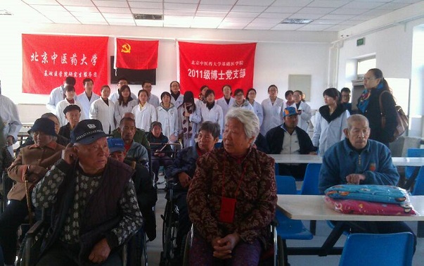 2013年10月26日,基础医公司2011级博士支部、2013级博士支部、2012级硕士支部以及本科第二支部,至怀柔镇敬老院联合开展敬老爱老中医健康卫生服务活动。活动由11级博士支部的支部书记赵娜老师带队,四个支部共26名党员骨干、积极分子参加。