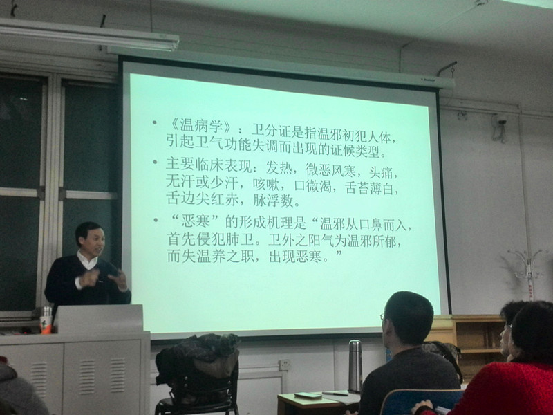 肖教授以:“表证是外感病初期吗?”“热邪可以导致恶寒吗?“根据恶寒和发热的轻重可以辨别外感病初期的寒热吗?”“风为阳邪吗?”“怎么祛风?“暑是什么?”“香薷饮是祛暑的吗?”“杏苏散是润燥的吗?”等问题开场,引发同学们思考。随后,肖教授指出太阳病的提纲条文中“恶寒”与太阳温病“不恶寒”的矛盾,进而通过表证的定义、特征、性质、分类等多方面证明温病无表证。肖教授还指出温病学派出现以后,中医解表法开始混乱。而教科书将恶寒作为外感热邪初期的固有表现更是造成学习中医者的迷惑。肖教授更表示中医中存在的悖论是历史遗留问题,靠他个人的能力并不能解决,但为了中医科学性发展,我们必须勇于质疑,勇于提出疑问。