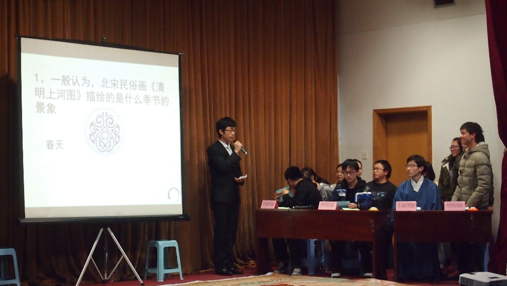 赛分为三个环节:分道扬镳、战国时代、秦皇一统。考查的内容全面广泛,从诗词、曲乐、习俗、历史等多个方面出题,更加考验选手们对中国传统文化是否有广泛的接触和扎实的积累。其中第一环节分为两部分,首先是“经典互动”,即选手与场下亲友团互动背诵抽取的经典典籍,由评委老师打分。各参赛队伍与其亲友团背诵得流畅纯熟、声音洪亮、抑扬顿挫,使现场气氛不断高涨。随后是“厚积薄发”,即每支队伍抽取一组题目,每组三题,每名队员必须且只能回答一题。第二环节“战国时代”采取一战到底的形式,由守擂方和攻擂方抽题作答。题目颇具难度,涉及知识面较为宽广,台上选手斗志斗勇,沉着应对,台下观众紧张而又认真地观看,不时地为选手们的精彩回答鼓掌。第三环节“秦皇一统”采取抢答形式,各队选手聚精会神,不敢丝毫掉以轻心,现场气氛更是紧张激烈。其中的乐曲辨析题尤为精彩,由表演者现场弹奏,不仅让观众享受到了美妙的乐曲,也反映出公司员工的多才多艺。全场气氛热烈而活泼,台上选手紧张作答,台下不时爆出阵阵掌声。在各个环节评委打分期间,学习部还特别设计了观众答题环节,并送出奖品。观众们答题踊跃,掀起赛场一个又一个高潮。最后基础医公司代表队以总分第一名成绩获得“状元”桂冠,第一临床代表队和第二临床代表队分别以第二、三名成绩,荣获“榜眼”与“探花”。