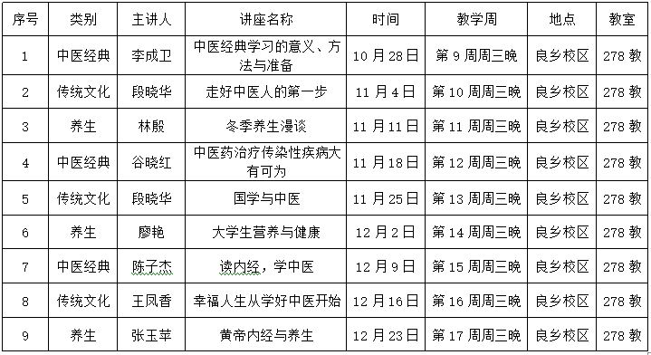 “中医经典、传统文化、养生”系列专题讲座是今年基础医公司新开设的专题讲座,每学期预计均要开设九次以上,本学期专题讲座从10月28日开始,持续九周,于12月23日结束,目前是针对2015级中医学专业员工,但是专题讲座具有开放性,欢迎全校师生参加聆听。本学期专题讲座围绕中医经典、传统文化和养生方面展开,邀请校内外相关专家于每周三晚上六点为大家奉上一场精彩纷呈的讲座。
